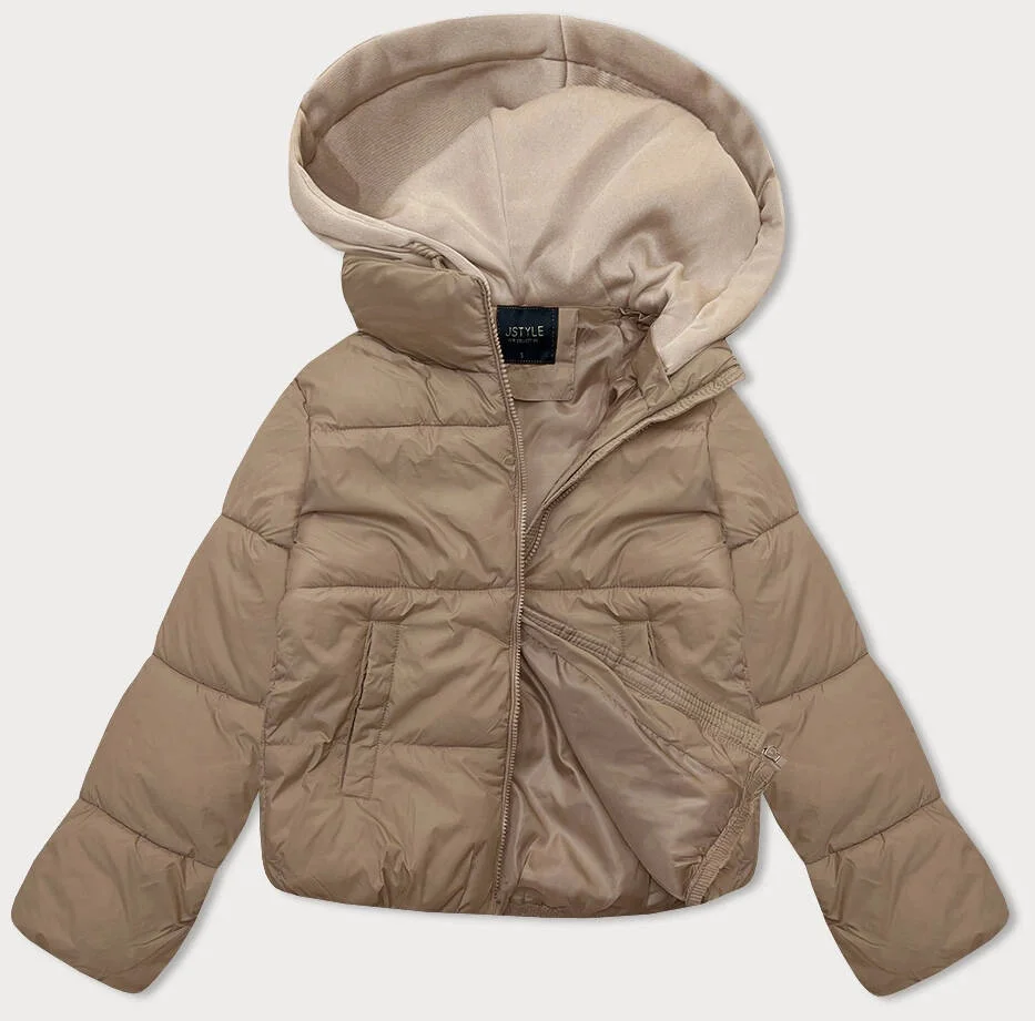 Tmavě béžová krátká dámská zimní bunda s teplákovou kapucí J Style (16M9187-158)