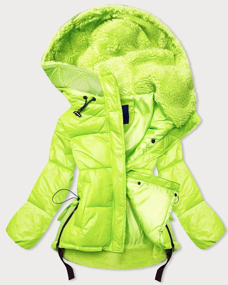 Neonově žlutá krátká dámská zimní bunda s kapucí (JIN211)