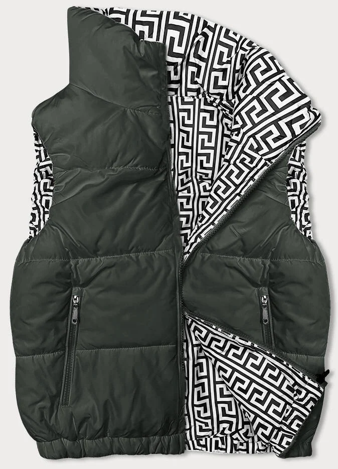 Krátká dámská péřová vesta v army barvě se stojáčkem (16M9092-136)