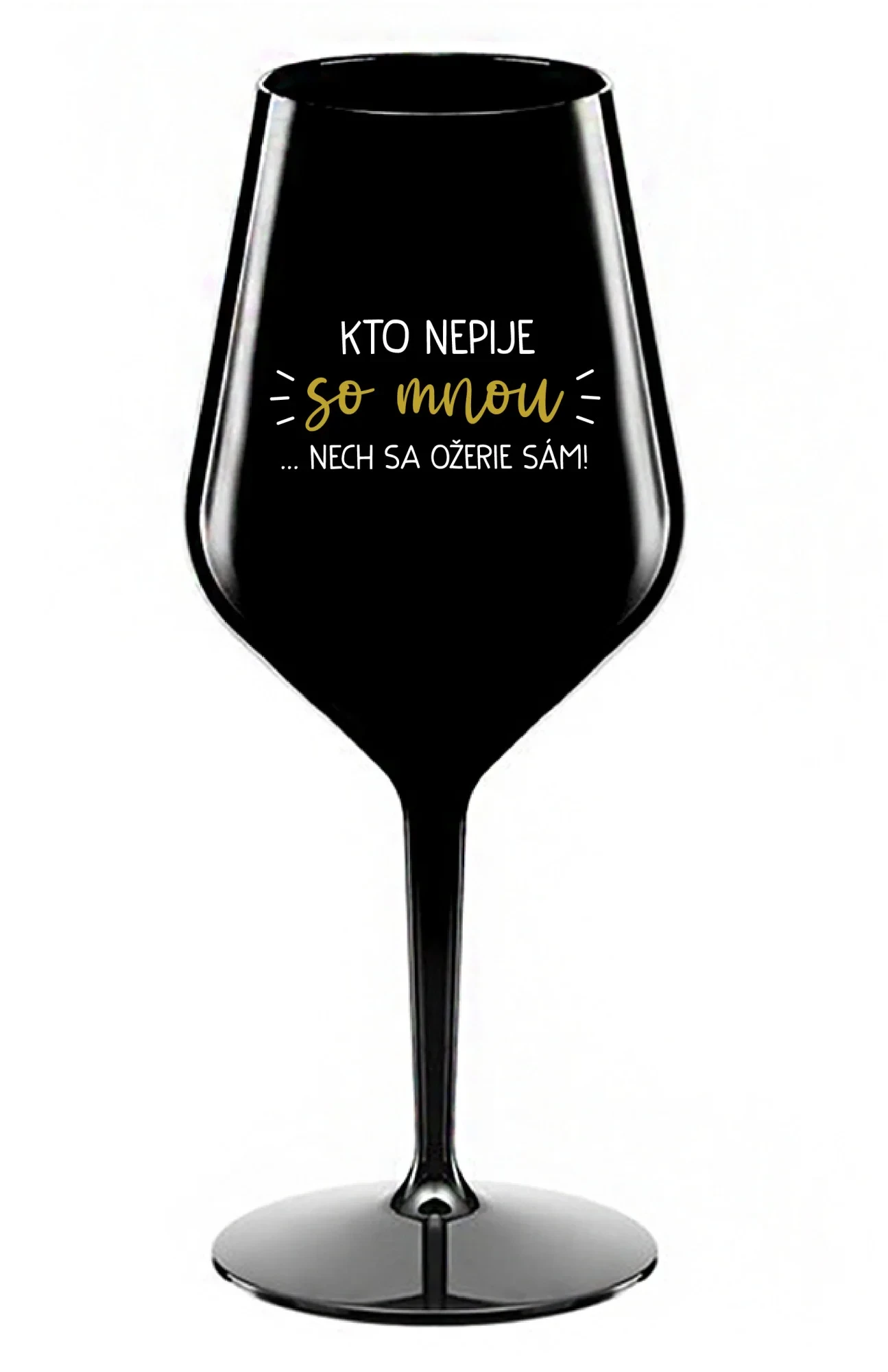 KTO NEPIJE SO MNOU...NECH SA OŽERIE SÁM! - čierny nerozbitný pohár na víno 470 ml