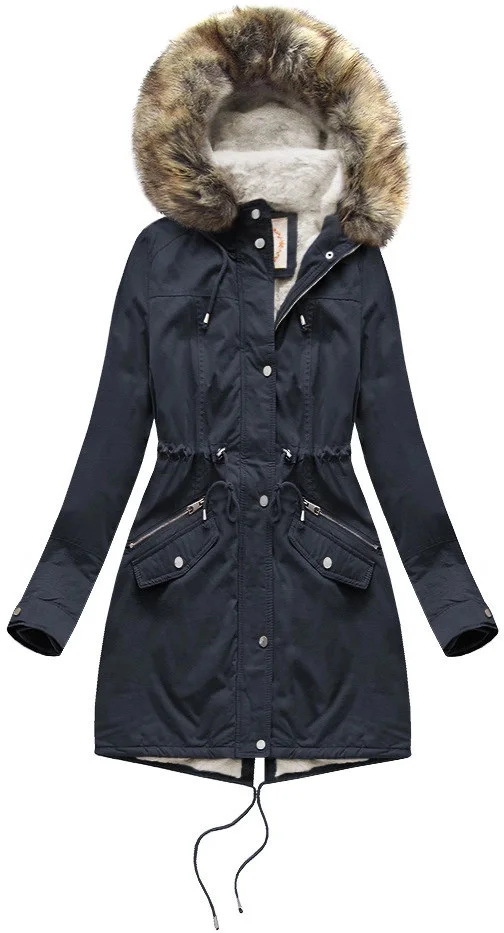 Tmavě modrá dámská bunda typu parka s mechovitou kožešinovou podšívkou a s kapucí (7602BIG)
