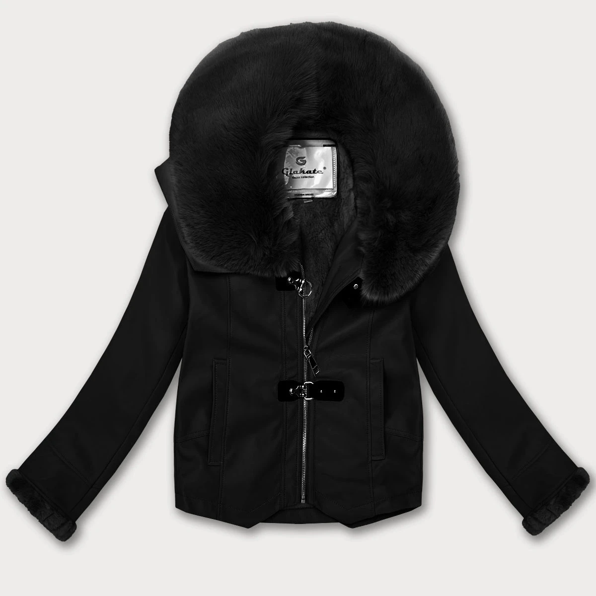 Černá bunda z ekologické kůže s kožešinovým límcem Glakate (LU98091#)
