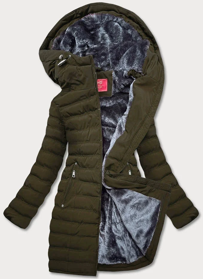 Bunda je vypasovaná, má kožešinovou podšívku, má dvě kapsy a zapíná se zipem. Model má kapuci, kterou není možné odepnout. Na koncích rukávů jsou skryté stahovací lemy. Bunda má délku do poloviny stehen.