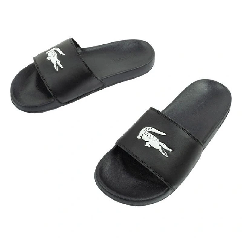 Široký pásek s výrazným logem Lacoste dodává žabkám moderní, rozpoznatelný charakter.