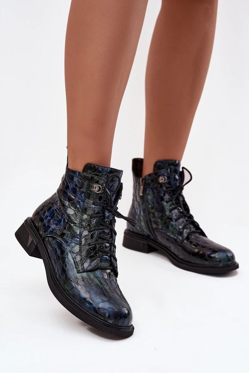 Dámské kotníkové boty vyrobené z přírodní lakované kůže jsou spojení elegance a moderního stylu. Díky lesklému povrchu vypadají velmi elegantně a jemné tlačení na horní části jim dodává originální charakter. Model má jak šněrování, tak praktický zip, což zajišťuje pohodlné nazouvání a možnost dokonalého přizpůsobení noze. Jemné vyhřívání zajišťuje, že boty se hodí i na chladnější dny, poskytují pohodlí a teplo. Jedná se o univerzální model, který skvěle doplní jak denní stylizace, tak i elegantnější outfity. Při výběru velikosti se řiďte tabulkou velikostí. Při výběru velikosti se řiďte tabulkou velikostí.