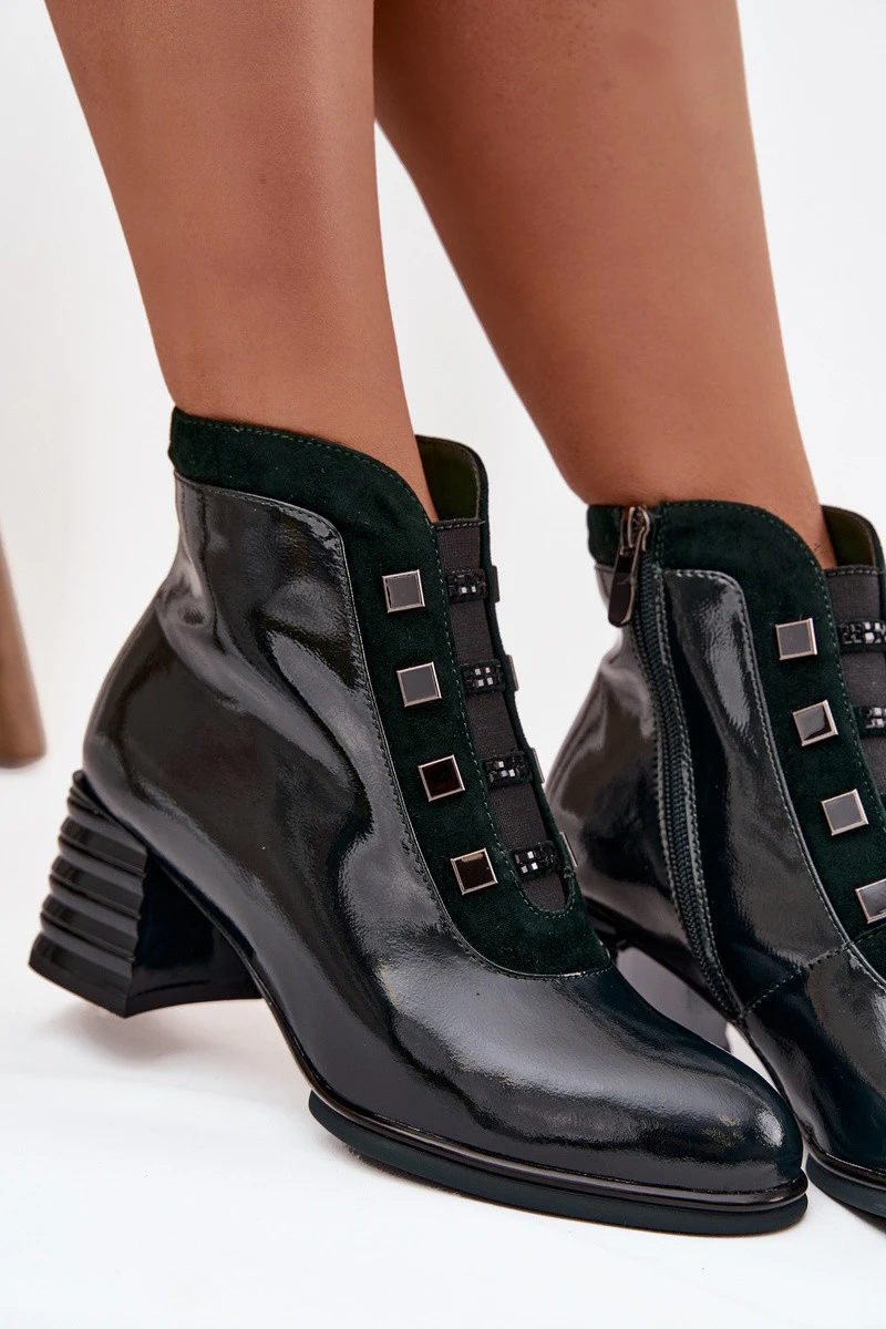 Stylové dámské botky D&A z pravé lakované kůže na středním sloupkovém podpatku jsou ideální pro elegantní i každodenní nošení. Model má zaoblenou špičku a boční zip, který usnadňuje obouvání a zajišťuje pohodlné přizpůsobení noze. Lakovaná kůže dodává botám lesklý, sofistikovaný vzhled a univerzální charakter.