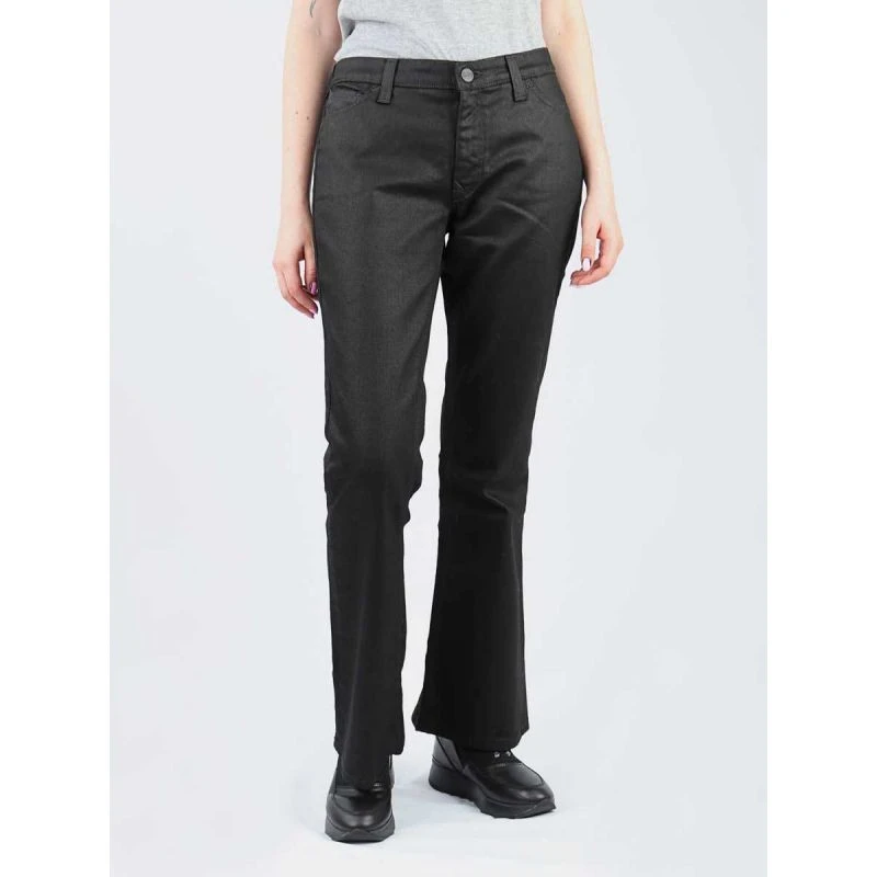 Dámské černé džínové kalhoty s nízkým pravidelným sedem a rozšířenými nohavicemi. Zapínání na zip a knoflík. Kožená nášivka na zadní straně v pase s logem výrobce.