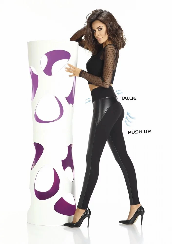 Stylové legíny z elastického materiálu s přídavkem eko-kůže, z materiálu SQUEEZE + ECO LEATHER s efekty push - up pozvedajícím zadeček, pas zpevněný pomocí široké gumy v pase, opticky zeštíhlené nohy.