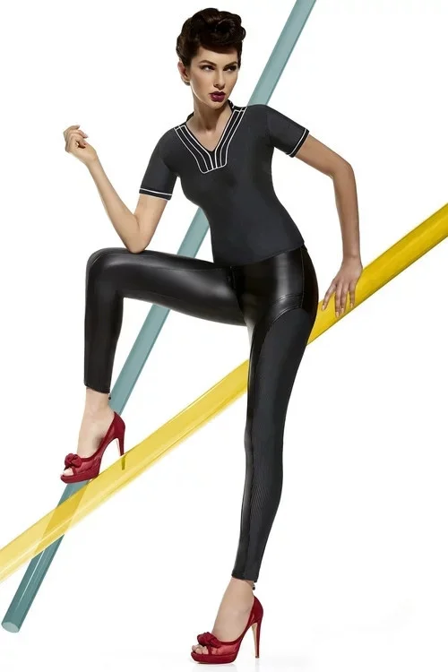 Elegantní dámské leginy Tiffany Bas Bleu jsou vyrobeny z imitace kůže v kombinaci s matným materiálem s jemným proužkem. Tímto spojením vznikl naprosto dokonalý model podtrhující ženskou svůdnost a smyslnost. Vsadka opticky prodlouží nohy. Díky elastičnosti materiálu leginy dokonale přilnou k postavě a zvýrazní Vaše křivky. V pase je zapínání na zip, vzadu guma. Kotníky zdobí funkční rozepínatelné zipy.