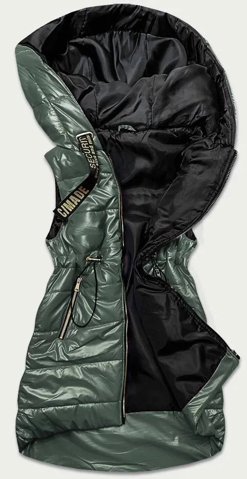 Vesta má trapézový střih a je zateplená syntetickou péřovou výplní. Model má kapuci, kterou není možné odepnout. Vesta má dvě kapsy a zapíná se zipem. Zipy jsou zlaté. V pase modelu jsou stahující gumy. Přední část modelu je kratší než zadní díl.