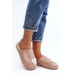 Błyszczące kapcie damskie ozdobione napisem i sercem. Model wsuwany z zakrytym noskiem. Osadzone na grubej podeszwie. Wkładka ocieplona futerkiem. Při výběru velikosti se řiďte tabulkou velikostí.