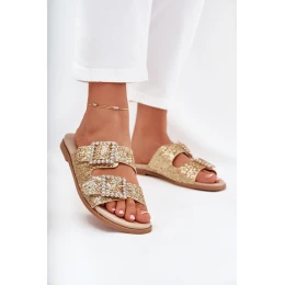 Lesklé zdobené pantofle s přezkami na plochém podpatku zlaté Tovira