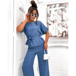 Halenka s krátkými kimonovými rukávy má lodičkový výstřih, délku k bokům a v pase se zavazuje. Kalhoty se širokými nohavicemi mají dvě kapsy a v pase mají gumu.