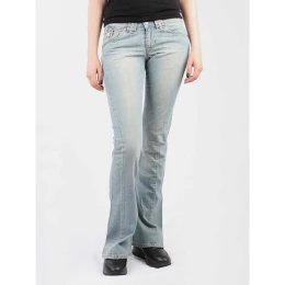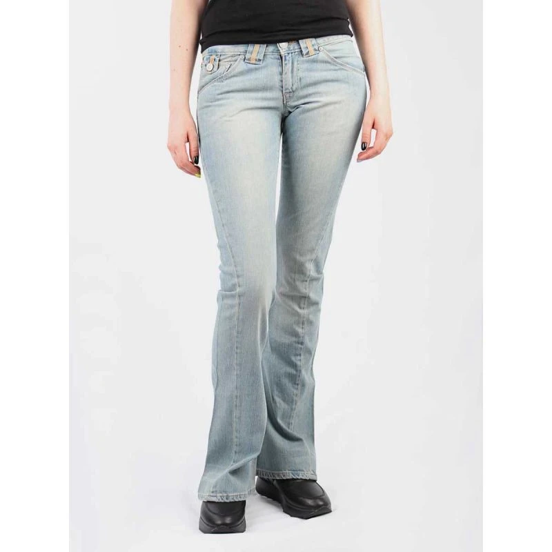 Dámské džínové kalhoty s nízkým sedem, širokými nohavicemi a zapínáním na zip a knoflík.