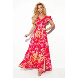 LIDIA - Růžové květované dlouhé dámské šaty s výstřihem a volánky 310-4