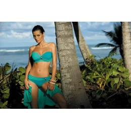 Oto kostium kąpielowy, który doda Ci seksapilu i wdzięku! Biustonosz posiada usztywniane miseczki, które doskonale unoszą, modelują i podtrzymują piersi. Do rozmiarów S, M, L, XL dodawane są poduszeczki push up, (można je wyjąć), które dodatkowo optycznie powiększają biust.Biustonosz otulono dwukolorową tkaniną o wysokiej jakości, dzięki temu kostium ładnie współgra z opalenizną. Pośrodku umieszczono elegancką, pozłacaną broszkę. Biustonosz posiada fiszbiny dolne oraz boczne, zapinany jest na klamerkę. Atutem są regulowane ramiączka, które można odpiąć w razie potrzeby.W zestawie finezyjne majteczki, ozdobione z przodu dwukolorowym a’la paseczkiem z ozdobną broszką. Figi posiadają gładki tył, nie prześwitują i dobrze przylegają do ciała.