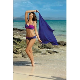 Oto kostium kąpielowy, który doda Ci seksapilu i wdzięku! Biustonosz posiada usztywniane miseczki, które doskonale unoszą, modelują i podtrzymują piersi. Do rozmiarów S, M, L, XL dodawane są poduszeczki push up, (można je wyjąć), które dodatkowo optycznie powiększają biust.Biustonosz otulono dwukolorową tkaniną o wysokiej jakości, dzięki temu kostium ładnie współgra z opalenizną. Pośrodku umieszczono elegancką, pozłacaną broszkę. Biustonosz posiada fiszbiny dolne oraz boczne, zapinany jest na klamerkę. Atutem są regulowane ramiączka, które można odpiąć w razie potrzeby.W zestawie finezyjne majteczki, ozdobione z przodu dwukolorowym a’la paseczkiem z ozdobną broszką. Figi posiadają gładki tył, nie prześwitują i dobrze przylegają do ciała.