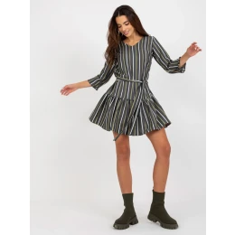 Tmavě šedé pruhované koktejlové šaty s vázáním .