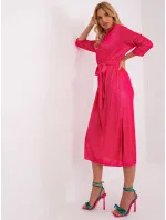 Tmavě růžové jednoduché koktejlové šaty s páskem .