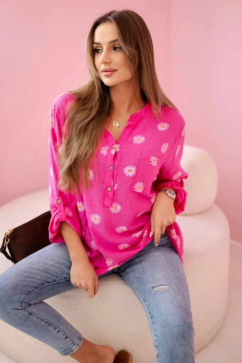 Lněná dámská halenka s květinovým vzorem, dlouhými rukávy a knoflíky Růžová