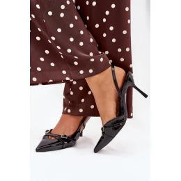 Dámské lodičky s odkrytou patou na jehlovém podpatku jsou skvělým návrhem pro speciální příležitosti. Vepředu mají dva zkřížené popruhy zdobené malými sponami, které jim dodávají jemný šarm. Špičaté špičky prodlužují nohy, dodávají postavě štíhlost a eleganci. Ideální na večerní výlety, svatby nebo jiné slavnostní události.