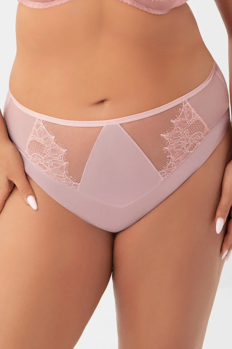 Wyższy stan. Zabudowany fason zasłaniający prawie całe pośladki. Wykonane z tiulu elastycznego z koronkowymi elementami na tiulu stabilnym.Ozdobne przeszycia metaliczną nitką. Tył z tiulu elastycznego wykończony na gładko, tak aby majtki nie odznaczały się pod ubraniem. Bawełniany kroczek