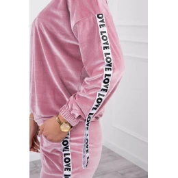 Představujeme vám sadu mikiny a kalhot. Sada z veluru. Mikina má stuhy s nápisem Love. Kalhoty s kapsami a zavazováním v pase. Velmi módní a stylová sada. Sada je vyrobena z vysoce kvalitního materiálu. Velikost je univerzální a vyhovuje dámám velikosti S, M nebo L.