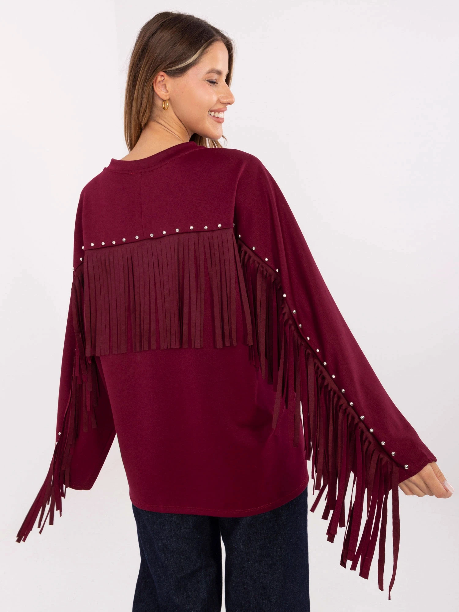 Volná dámská mikina ve vínové bordó barvě s třásněmi (21695)