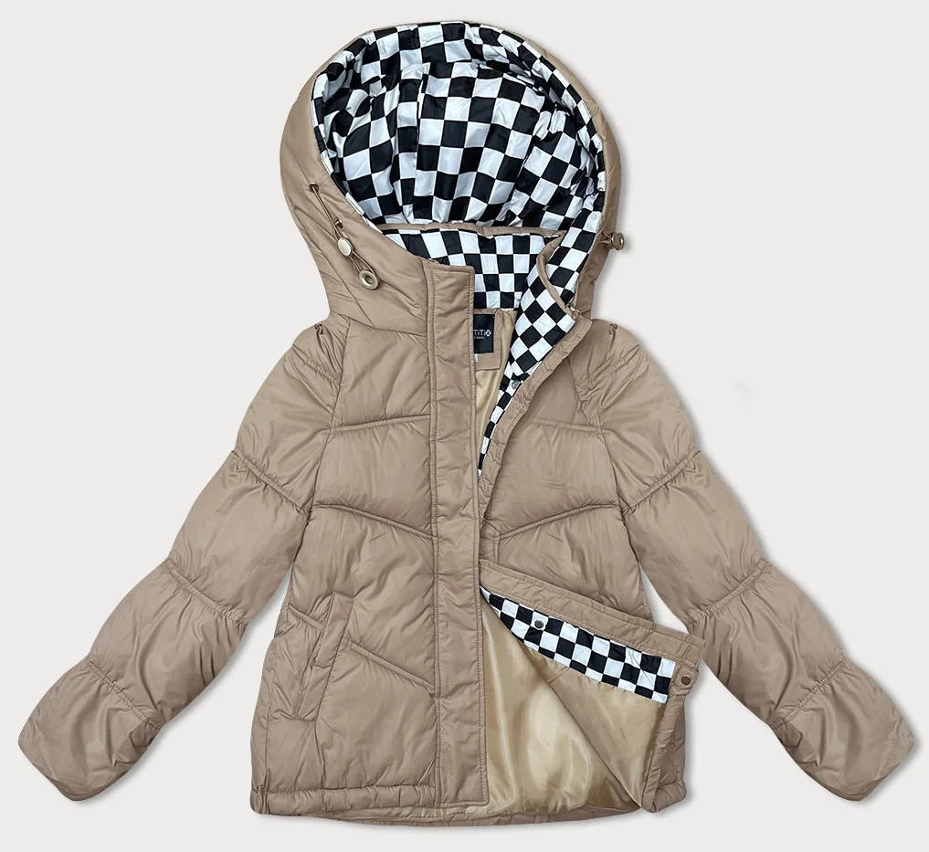 Bunda má volný střih, je zateplená syntetickou péřovou výplní, má dvě kapsy se zapínáním na patentky a zapíná se zipem. Model má stojáček a kapuci, kterou není možné odepnout. Na koncích rukávů jsou skryté stahovací lemy. Bunda má délku k bokům.