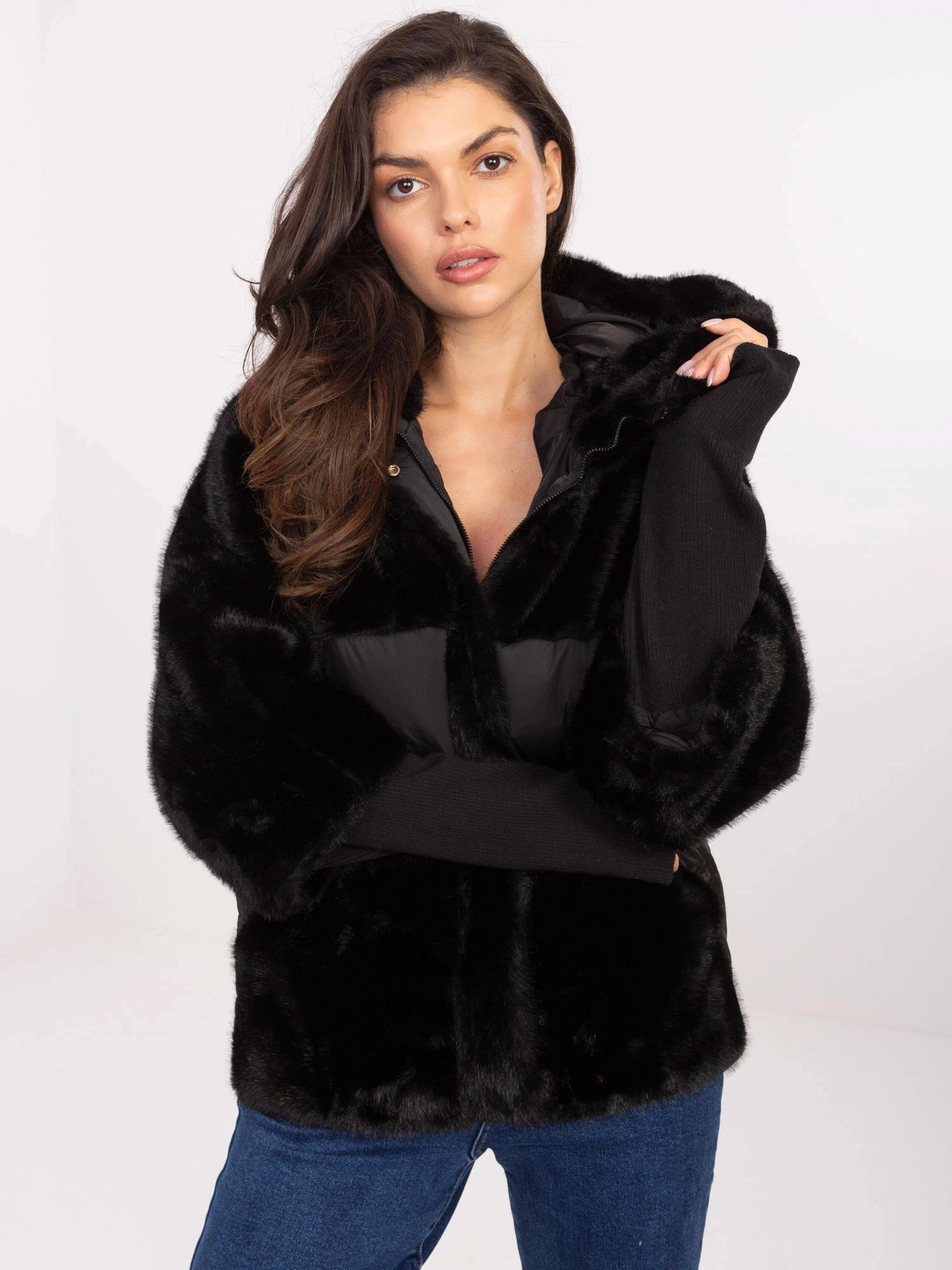 Černá volná bunda z různých materiálů (WJ218)