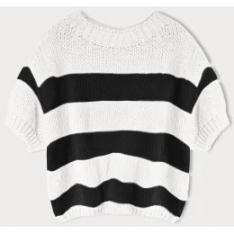 Svetr je pletený ažurovým vzorem a má krátké rukávy. Model má délku k bokům.