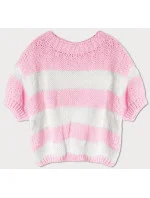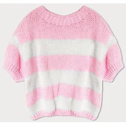 Svetr je pletený ažurovým vzorem a má krátké rukávy. Model má délku k bokům.