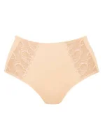 Vysoké, plné kalhotky Anita s nejvyšším komfortem nošení. Širší boky dokonale přiléhají a zadní část perfektně drží hýždě. Na bocích vyšívané květinové vsadky na průsvitném tylu.