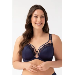 Na zdjęciu widoczna jest uśmiechnięta kobieta w granatowym biustonoszu o eleganckim, kobiecym kroju. Stanik ma gładkie, profilowane miseczki oraz subtelne koronkowe wstawki w górnej części, które nadają całości lekkości i zmysłowego charakteru. Dekolt zdobią cienkie, dekoracyjne paseczki tworzące delikatną ramkę, a środek łączy niewielka ozdoba. Ramiączka są regulowane i również wykończone koronką. Zdjęcie wykonano na jasnym, neutralnym tle, co podkreśla kolor i detale bielizny oraz sprawia, że całość wygląda klasycznie i estetycznie.