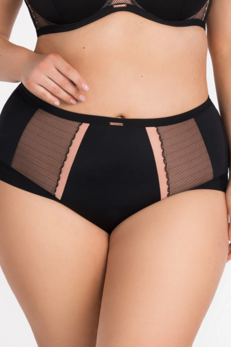Dámské kalhotky v černé barvě, vyrobené v pohodlném, více postaveném střihu pro stabilní střih a dobré krytí. Střední přední a zadní část je hladká, vyrobená z měkkého materiálu, který pohodlně sedí na těle a zůstává diskrétní pod oblečením. Na bocích jsou lehké panely z elastické síťoviny, zakončené ozdobnou vlnovkou, která celku dodává moderní lehkost a jemně zvýrazňuje boky. V pase je umístěna malá ozdobná destička, která podtrhuje elegantní charakter modelu.