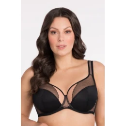 Ten czarny biustonosz to klasyka w nowoczesnym, zmysłowym wydaniu. Gładkie, miękko usztywniane miseczki w dolnej części gwarantują świetne podtrzymanie i ładne wymodelowanie biustu, a ich górna część została wykończona lekkim, transparentnym tiulem z delikatnym wzorem. Dzięki temu całość wygląda subtelnie, ale bardzo efektownie.