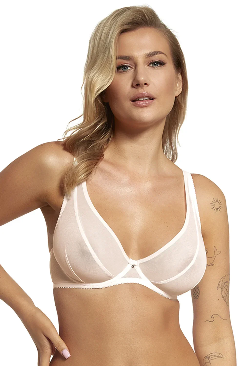 Podprsenka značky Lupo, model 150, s drátky, které podporují a tvarují prsa. Výrobek má nastavitelná ramínka bez možnosti odepnutí. Zapínání na háčky. Místo zapínání: na zádech. 2 řady svislých háčků. 3 úrovně vodorovných háčků. Výrobek je vyroben z 85% polyamidu, 15% elastanu. Dámský výrobek.