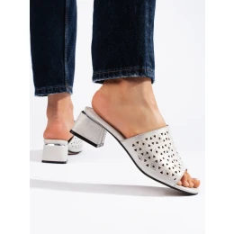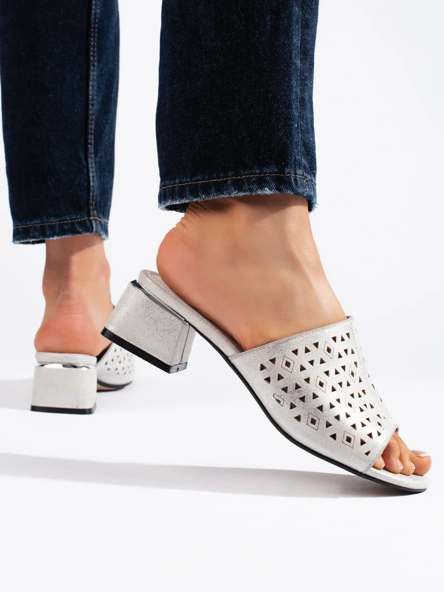 Luxusní dámské nazouváky stříbrné na širokém podpatku