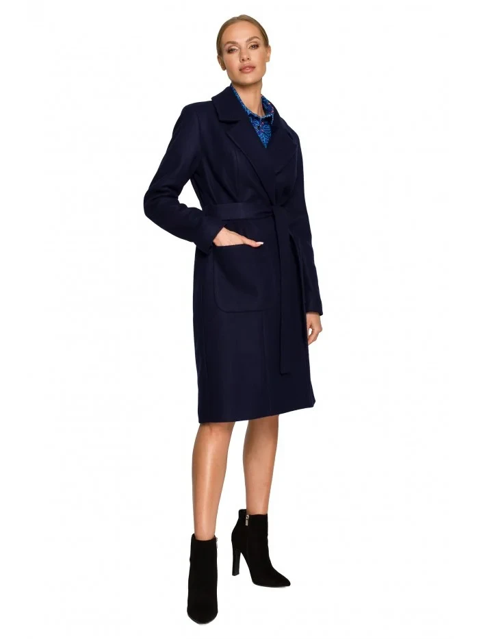 M708 Fleecový kabát s páskem a kapsami s nášivkami - tmavě modrý