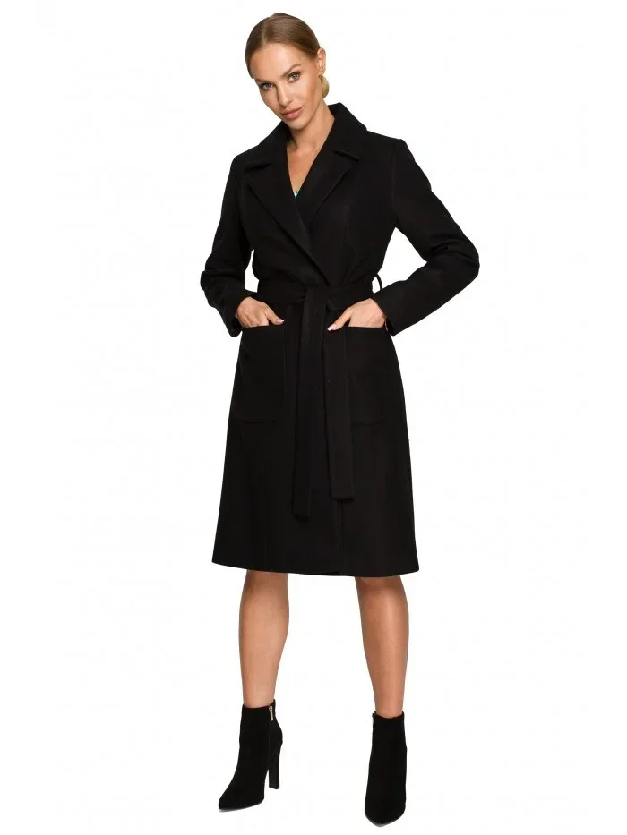 M708 Fleecový kabát s páskem a kapsami - černý
