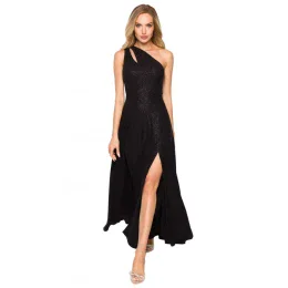 95% polyester 5% elastan Elegantní a šik. Tyto šaty ozvláštní každou příležitost. Dlouhý rozšířený střih s vysokým rozdělením nohou a vypasovaným vrškem na jedno rameno se sexy výřezem. INFORMACE O PRODUKTU: úpletová tkanina se třpytkami maxi délka šatů s detailem na jedno rameno vypasovaný vršek s rozdělením na rameni skrytý boční zip rozšířená maxi sukně s vysokým rozdělením nohou bez podšívky naše modelka měří 171 cm a nosí velikost S