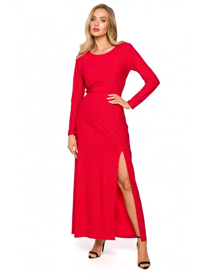 95% polyester 5% elastan Večerní šaty připravené pro zvláštní příležitost. Lehká tkanina s třpytivým povrchem, dlouhý a elegantní střih s vysokým rozdělením nohavic a tenkými dlouhými rukávy. INFORMACE O VÝROBKU: úpletová tkanina s třpytkami maxi délka šatů s dlouhými rukávy vyztužená ramena uvolněný střih, vypasovaný horní díl skrytý zip na boku áčková maxi sukně s vysokým rozdělením nohavic bez podšívky naše modelka je vysoká 171 cm a nosí velikost S