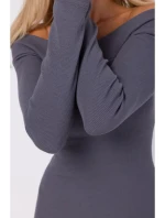 95% polyester 5% elastan INFORMACE O PRODUKTU: žebrovaná pletenina tělové midi šaty s designem off shoulder dlouhé rukávy přetažené přes hlavu naše modelka je vysoká 171 cm a nosí velikost S Navrženo a vyrobeno v Polsku