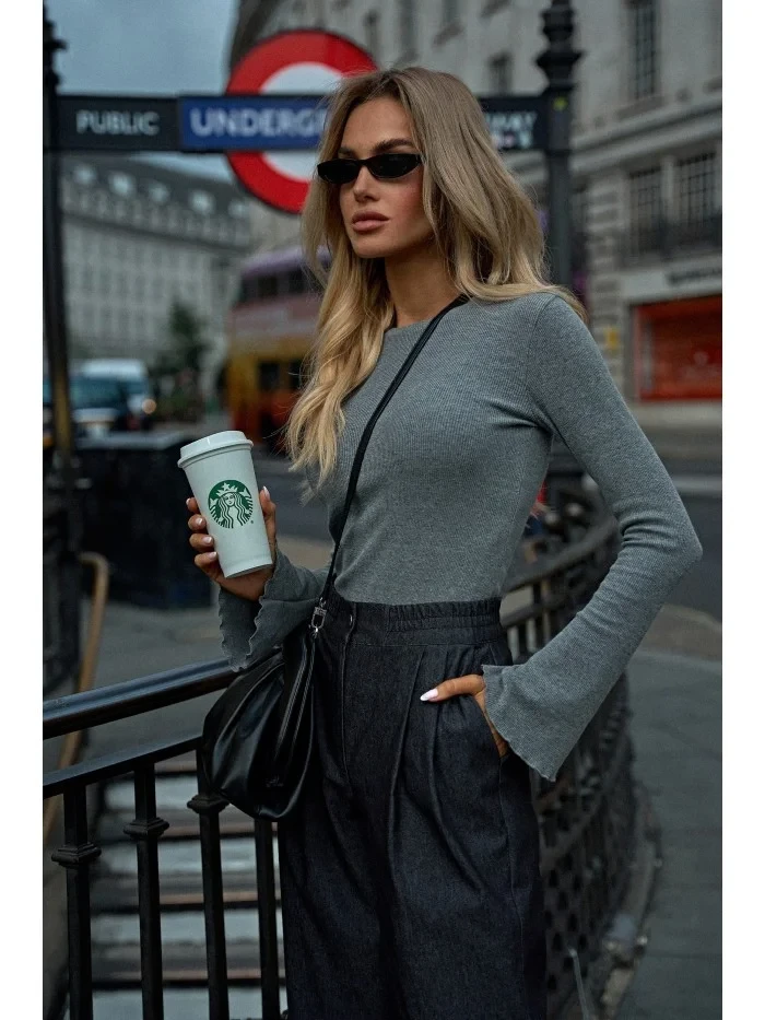 M806 Žebrovaný top s dlouhými rukávy - šedý melír
