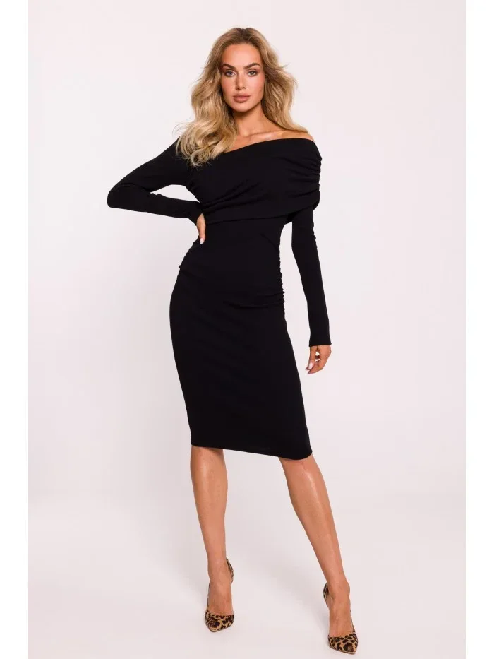 M820 Asymetrické šaty s výstřihem z žebrového úpletu - černé