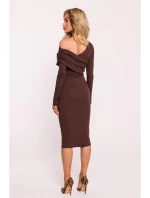 M820 Asymetrické šaty s výstřihem z žebrového úpletu - hnědé
