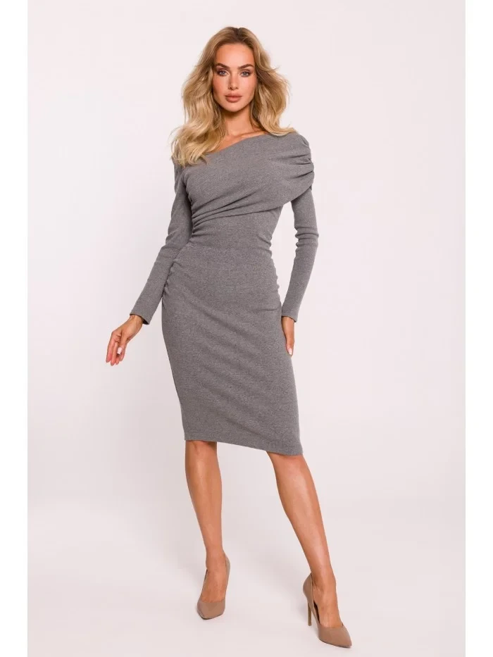 M820 Asymetrické šaty z žebrového úpletu s výstřihem - šedý melír
