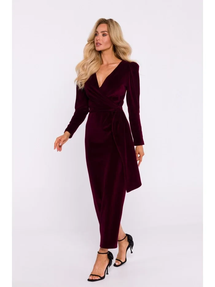 80% bavlna 20% polyester INFORMACE O PRODUKTU: úpletová tkanina - sametové maxi šaty přetažené přes hlavu zavinovací vršek s šerpou vysoké rozdělení na zádech 7/8 rukávy se záhybem částečně lemované skrytý boční zip náš model je 171 cm vysoký a nosí velikost S navrženo a vyrobeno v Polsku