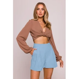 76% bavlna 21% polyester 3% elastan MATERIÁL Materiál: bavlněná tkanina, matná úprava PODROBNOSTI O PRODUKTU Pas: vysoký střih Pásek: elastický pásek, plisovaný přední díl Zapínání: skrytý zip se dvěma knoflíky Kapsy: boční kapsy Model: M860 Navrženo a vyrobeno v Polsku Modelka na fotografii měří 171 cm a má na sobě velikost S STŘIH A VÝSTŘIH Střih: uvolněný a pohodlný Tvar: mírně rozšířené nohavice Délka: krátké nohavice