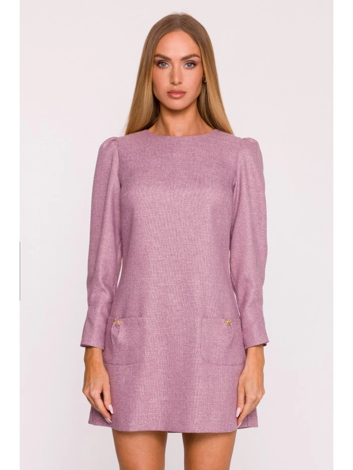70% polyester 27% wiskoza 3% elastan MATERIÁL Látka: Tkanina Tweed PODROBNOSTI O VÝROBKU Výstřih: Lodičkový výstřih Rukávy: Dlouhé, nabírané na ramenou a se záševky na manžetách Zapínání: Skrytý zip na zádech Kapsy: Náramkové kapsy vpředu s ozdobnými mašlemi ve stylu šperků Podšívka: Žádná Vzor: Mélange Model: M870Navrženo a vyrobeno v Polsku Modelka na fotografii měří 171 cm a má na sobě velikost S STŘIH A VÝSTŘIH Střih: áčkový Tvar: Mírně vypasovaný na ramenou, volný na bocích Délka: Mini